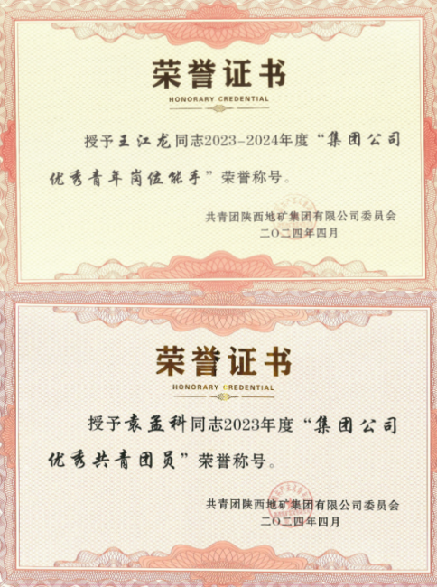 4月26日,在陜西地礦集團(tuán)團(tuán)委慶祝中華人民共和國成立75周年團(tuán)青先進(jìn)表彰暨“青春為中國式現(xiàn)代化挺膺擔(dān)當(dāng)”主題培訓(xùn)會(huì)上,我公司王江龍同志榮獲陜西地礦集團(tuán)2023-2024年度“優(yōu)秀青年崗位能手”稱號(hào),袁孟科同志榮獲陜西地礦集團(tuán)2023年度“優(yōu)秀共青團(tuán)員”稱號(hào)。