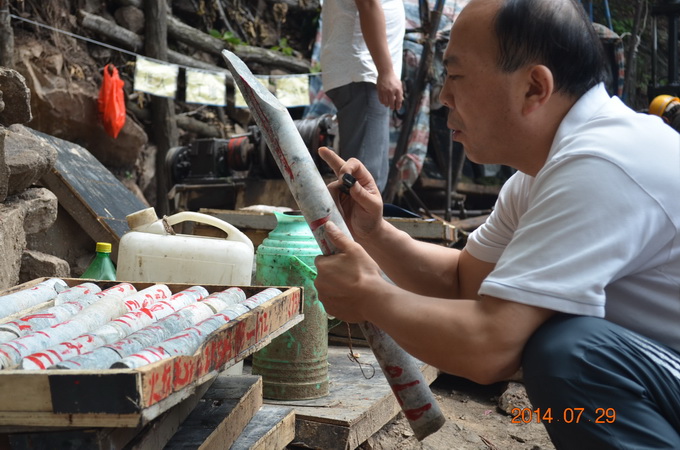 該項目是我隊繼小秦嶺整裝勘查潼關(guān)自有礦權(quán)區(qū)中深部探礦系統(tǒng)工程之后的又一探礦項目。在總公司領(lǐng)導(dǎo)的關(guān)心支持下,隊主要領(lǐng)導(dǎo)非常重視,多次前往項目實施地進(jìn)行現(xiàn)場檢查指導(dǎo)。目前,項目相關(guān)手續(xù)辦理及鉆探施工正有序進(jìn)行,總體進(jìn)展順利,鉆孔不同深度見有多層礦化。在檢查ZK503提取的巖心時,王隊長手持地質(zhì)放大鏡仔細(xì)查看,他要求施工和相關(guān)技術(shù)人員要隨時注意巖心變化情況,特別對不同標(biāo)高段出現(xiàn)的不同地質(zhì)情況要認(rèn)真記錄、仔細(xì)分析、及時報告,不能漏掉任何細(xì)節(jié)。