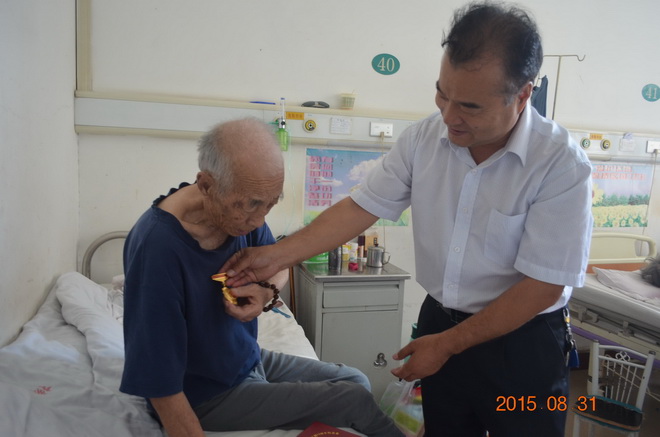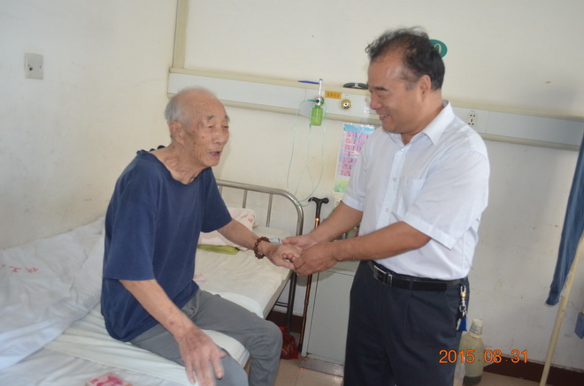 在臨潼417醫(yī)院病房,黨委書記與抗戰(zhàn)老兵阮恩紀(jì)一起回憶革命戰(zhàn)爭時期的崢嶸歲月和中國共產(chǎn)黨走過的光輝歷程,同時還關(guān)切地詢問他的病情及康復(fù)情況,囑咐他要積極配合醫(yī)生治療、保重身體。
