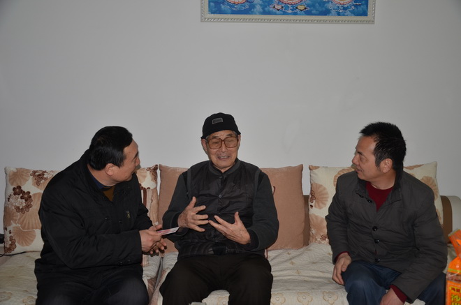 圖為工會(huì)主席夏元鵬、隊(duì)長(zhǎng)助理王倉武慰問抗戰(zhàn)老兵郭振彥