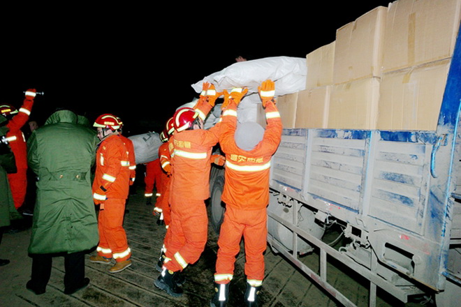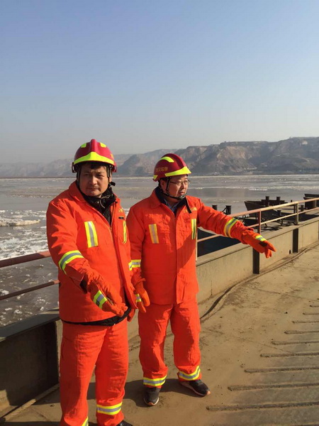 夜晚黃河橋冷風(fēng)刺骨,氣溫低達(dá)-8℃。按照總隊(duì)制定的攔截壩敷設(shè)方案,劉曉東、王和平帶領(lǐng)突擊隊(duì)員頂著凜冽的寒風(fēng),與渭南市、合陽(yáng)縣環(huán)保局工作人員一起搶卸卡車(chē),將鋼絲繩、扳手、鉗子、活性炭包等應(yīng)急器材器具迅速配送到位,隨時(shí)準(zhǔn)備敷設(shè)攔截壩。所有人都在急切地等待著上游的監(jiān)測(cè)結(jié)果。